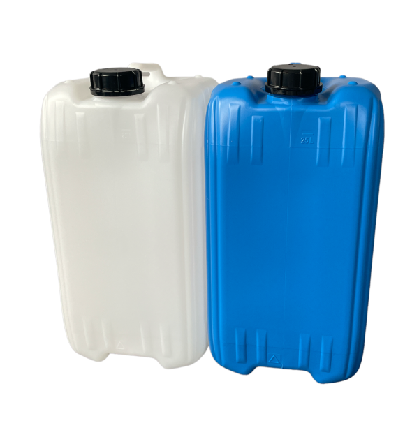 Kleiner naturfarbener HDPE-Kanister mit einem Fassungsvermögen von 25 Litern. Die verstärkten Innenrippen in den Ecken sorgen für zusätzliche Stabilität, ohne das Gewicht zu erhöhen. Ein praktischer Tragegriff erleichtert den Transport. Typische Anwendungsbereiche sind Lebensmittel und Getränke, Reinigungsmittel, pharmazeutische Wirkstoffe sowie chemische Produkte und Gefahrgüter wie Pflanzenschutzmittel. Der Kanister ist UN-zertifiziert für Gefahrstoffe.